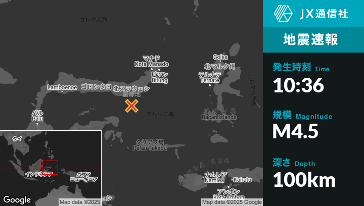 3月29日 10:36頃、インドネシアのModisiから南西71kmの地点でM4.5の地震がありました。