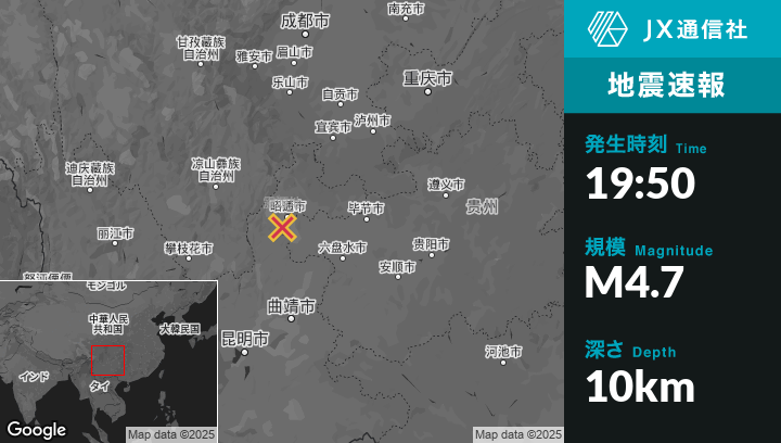 3月29日 19:50頃、中国のZhaotongから南西12kmの地点でM4.7の地震がありました。