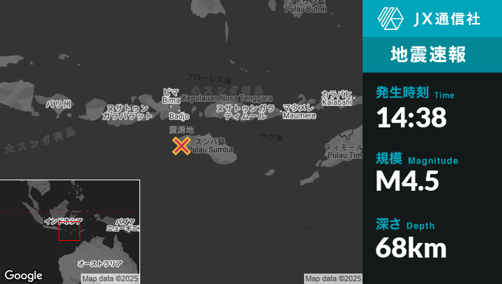 | 震源地 | インドネシアのTambolakaから南西25kmの地点 |