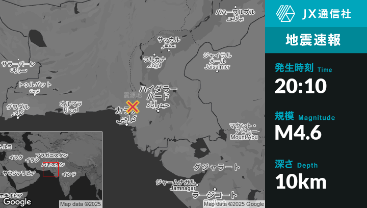 3月31日 20:10頃、パキスタンのUthalから東南東65kmの地点でM4.6の地震がありました。