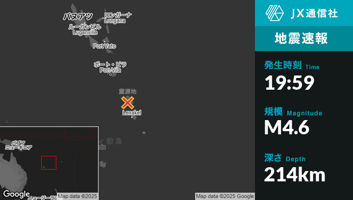 4月25日 19:59頃、バヌアツのIsangelから北北西83kmの地点でM4.6の地震がありました。