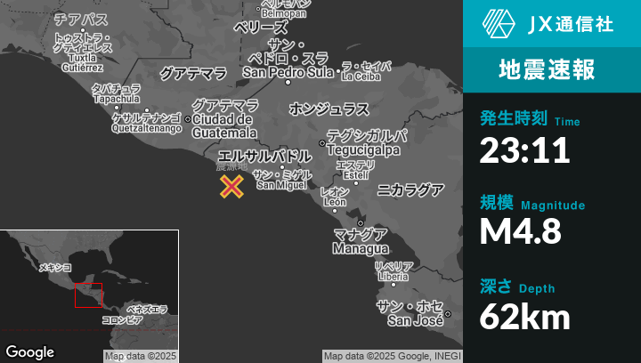 4月25日 23:11頃、エルサルバドルのLa Libertadから南南西42kmの地点でM4.8の地震がありました。