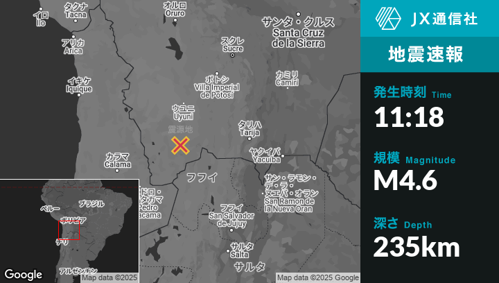 4月28日 11:18頃、ボリビアのAtochaから南西103kmの地点でM4.6の地震がありました。