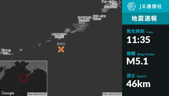 | 震源地 | アラスカのNikolskiから南57kmの地点 |