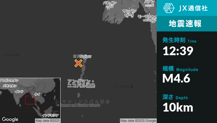 4月28日 12:39頃、インドのBamboo Flatから北156kmの地点でM4.6の地震がありました。