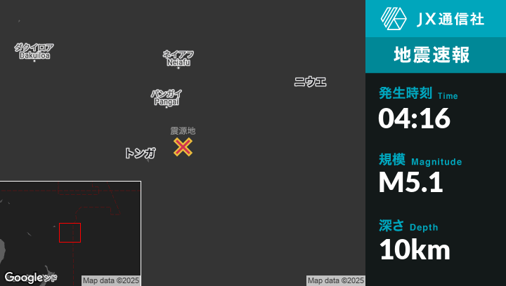 4月30日 04:16頃、トンガのPangaiから南南東126kmの地点でM5.1の地震がありました。