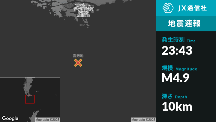 5月02日 23:43頃、アルゼンチンのUshuaiaから南277kmの地点でM4.9の地震がありました。