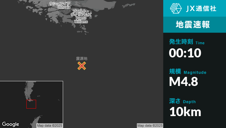| 震源地 | アルゼンチンのUshuaiaから南258kmの地点 |