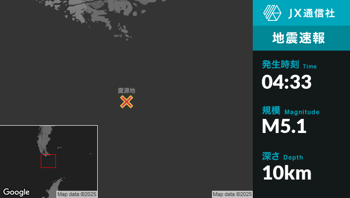 5月03日 04:33頃、アルゼンチンのUshuaiaから南南東297kmの地点でM5.1の地震がありました。