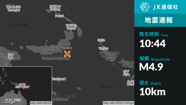 | 震源地 | パプアニューギニアのKimbeから東南東192kmの地点 |