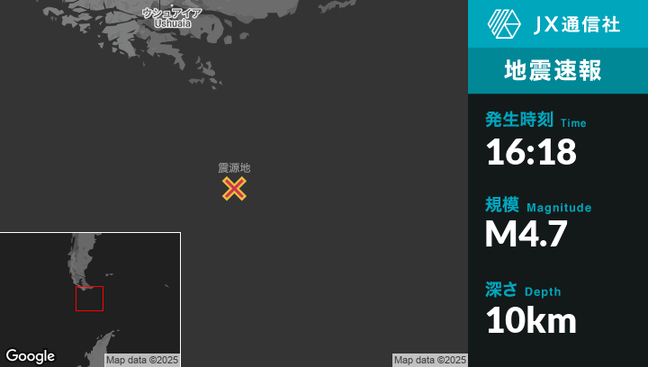 5月03日 16:18頃、アルゼンチンのUshuaiaから南南東285kmの地点でM4.7の地震がありました。