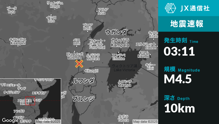 5月05日 03:11頃、ウガンダのNtungamoから北26kmの地点でM4.5の地震がありました。
