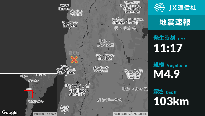 | 震源地 | チリのSalamancaから南南東9kmの地点 |