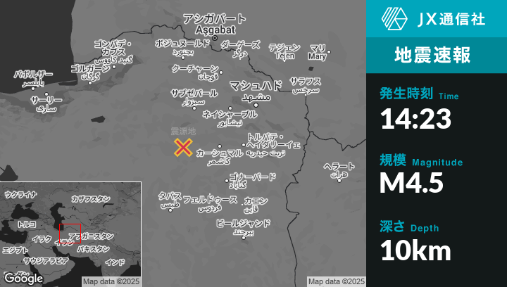 5月08日 14:23頃、イランのBardaskanから西57kmの地点でM4.5の地震がありました。