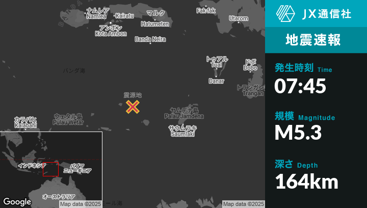 5月10日 07:45頃、東ティモールのLospalosから東北東282kmの地点でM5.3の地震がありました。