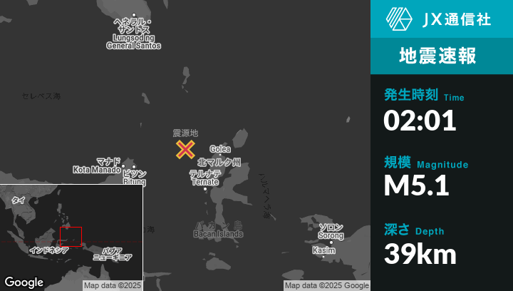 | 震源地 | インドネシアのTobeloから西北西145kmの地点 |