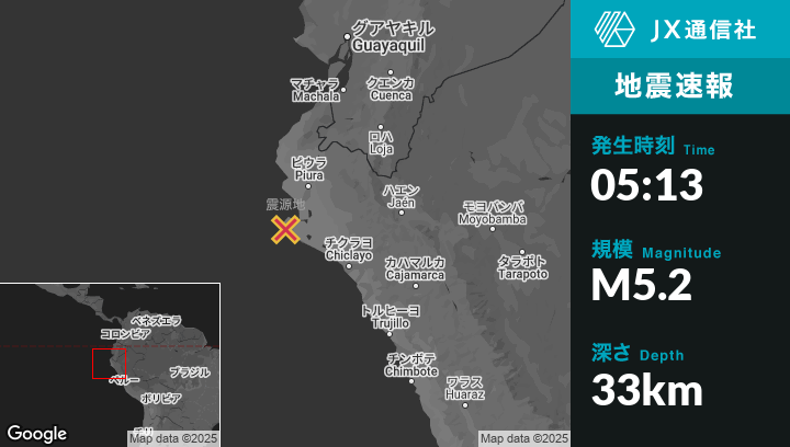 5月15日 05:13頃、ペルーのSechuraから南西50kmの地点でM5.2の地震がありました。