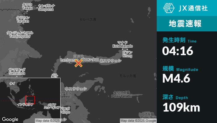 5月16日 04:16頃、インドネシアのGorontaloから西161kmの地点でM4.6の地震がありました。