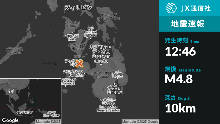 5月18日 12:46頃、フィリピンのManukanから北11kmの地点でM4.8の地震がありました。