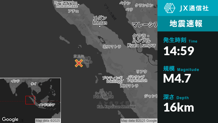 | 震源地 | インドネシアのGunungsitoliから西南西60kmの地点 |