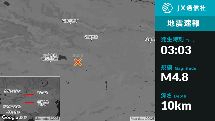 5月20日 03:03頃、中国のSishilichengziから東142kmの地点でM4.8の地震がありました。
