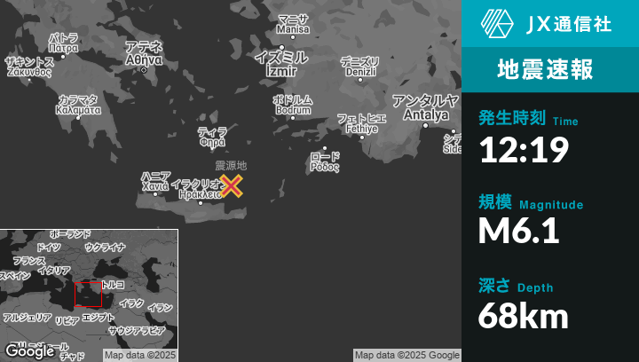 | 震源地 | ギリシャのEloúndaから北北東58kmの地点 |