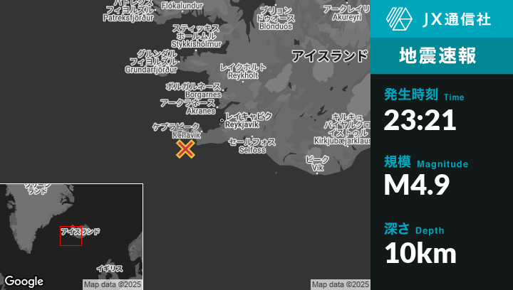 5月24日 23:21頃、アイスランドのSandgerðiから南西31kmの地点でM4.9の地震がありました。