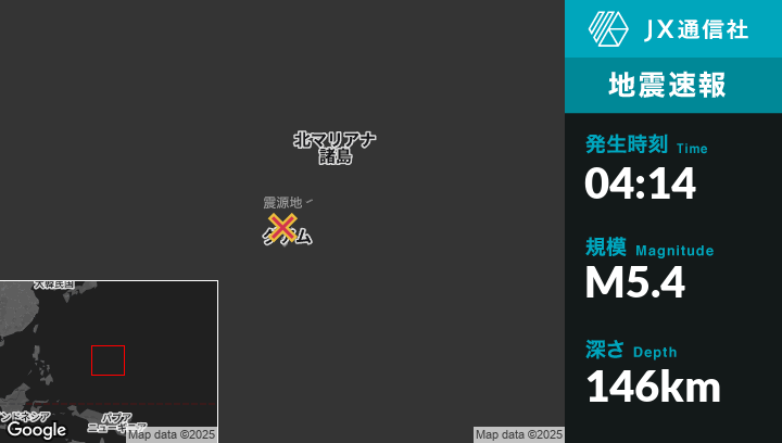 6月24日 04:14頃、グアムのAsan-Maina Villageから北北西31kmの地点でM5.4の地震がありました。