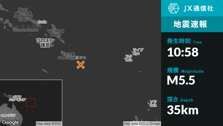 6月24日 10:58頃、ソロモン諸島のKirakiraから南東105kmの地点でM5.5の地震がありました。