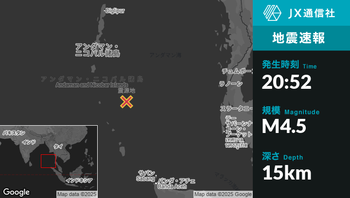6月26日 20:52頃、インドのPort Blairから南南東291kmの地点でM4.5の地震がありました。