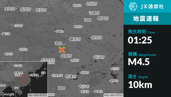 6月27日 01:25頃、中国のYichangから北北東64kmの地点でM4.5の地震がありました。