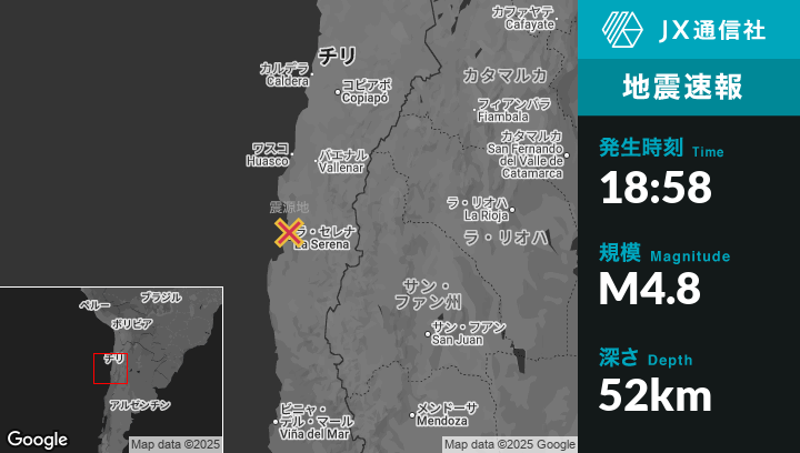 6月28日 18:58頃、チリのLa Serenaから北21kmの地点でM4.8の地震がありました。