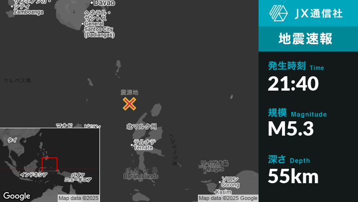 | 震源地 | インドネシアのTobeloから北西138kmの地点 |