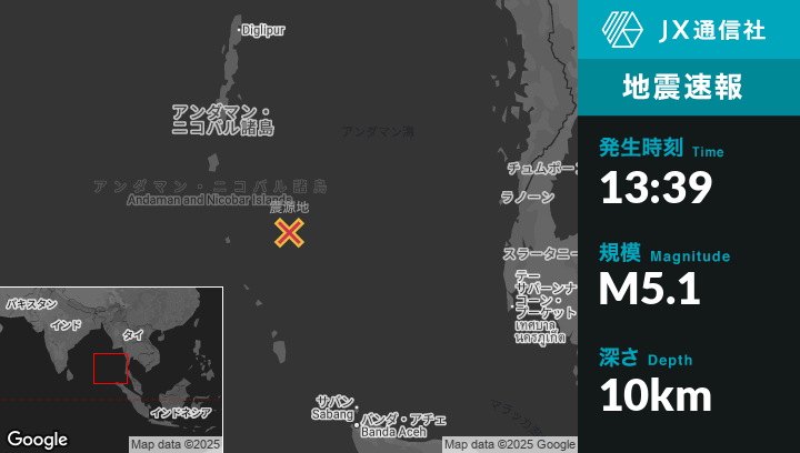 | 震源地 | インドのPort Blairから南南東280kmの地点 |