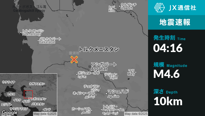 7月02日 04:16頃、トルクメニスタンのBaharlyから西29kmの地点でM4.6の地震がありました。