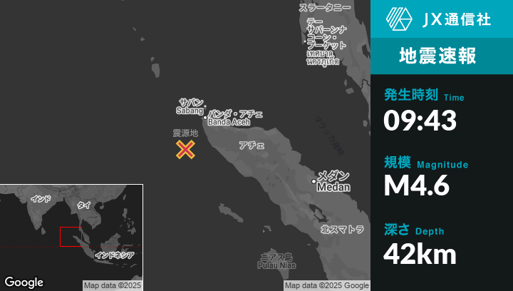 | 震源地 | インドネシアのBanda Acehから南西116kmの地点 |