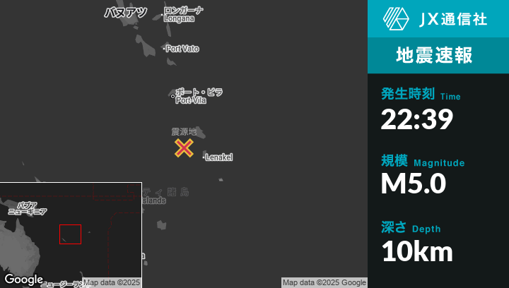 7月03日 22:39頃、バヌアツのIsangelから北西78kmの地点でM5.0の地震がありました。