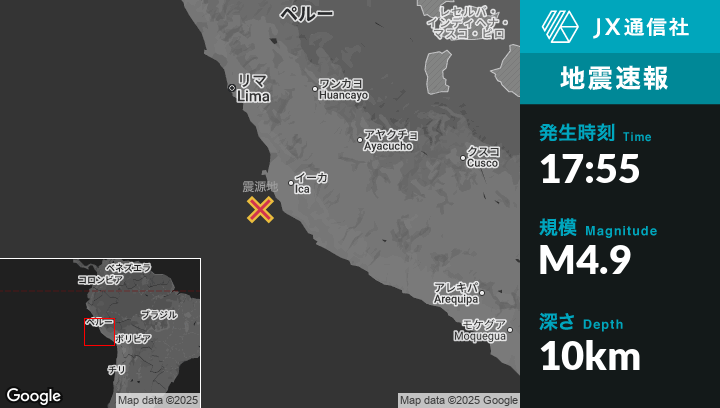| 震源地 | ペルーのParacasから南南西73kmの地点 |