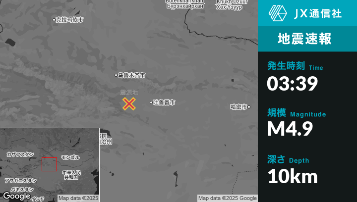 7月10日 03:39頃、中国のTurpanから西80kmの地点でM4.9の地震がありました。