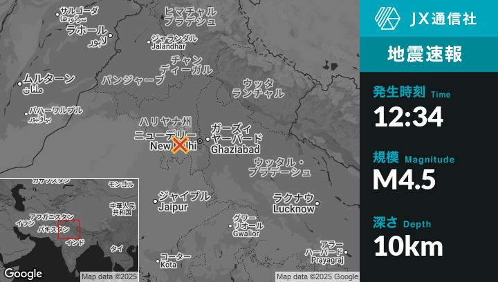 7月10日 12:34頃、インドのJhajjarから西7kmの地点でM4.5の地震がありました。