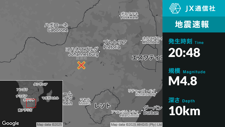 7月10日 20:48頃、南アフリカのOrkneyから北東8kmの地点でM4.8の地震がありました。