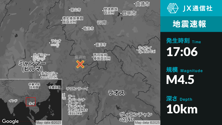 7月14日 17:06頃、ビルマ(ミャンマー)のKēng Tungから南東0kmの地点でM4.5の地震がありました。