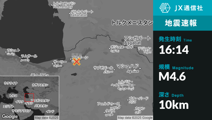 7月15日 16:14頃、イランのQarnābādから東23kmの地点でM4.6の地震がありました。