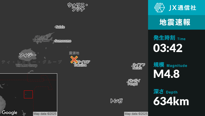 7月16日 03:42頃、フィジーのLevukaから東237kmの地点でM4.8の地震がありました。