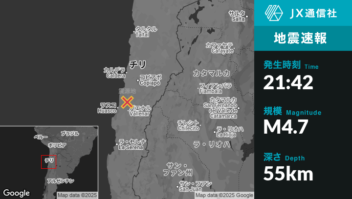 7月16日 21:42頃、チリのVallenarから北50kmの地点でM4.7の地震がありました。