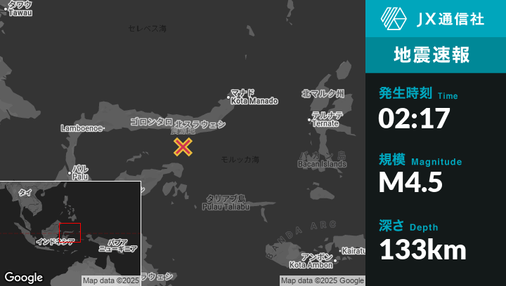 | 震源地 | インドネシアのGorontaloから南東67kmの地点 |