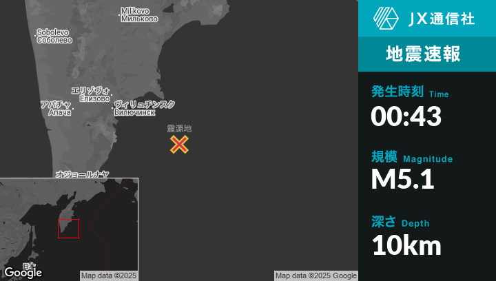 | 震源地 | ロシアのPetropavlovsk-Kamchatskyから南東154kmの地点 |