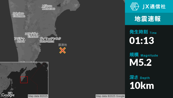 | 震源地 | ロシアのPetropavlovsk-Kamchatskyから東南東146kmの地点 |