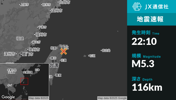 8月27日 22:10頃、台湾のYilanから東北東17kmの地点でM5.3の地震がありました。