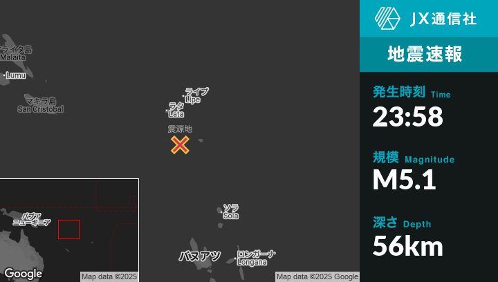 8月30日 23:58頃、ソロモン諸島のLataから南南東113kmの地点でM5.1の地震がありました。